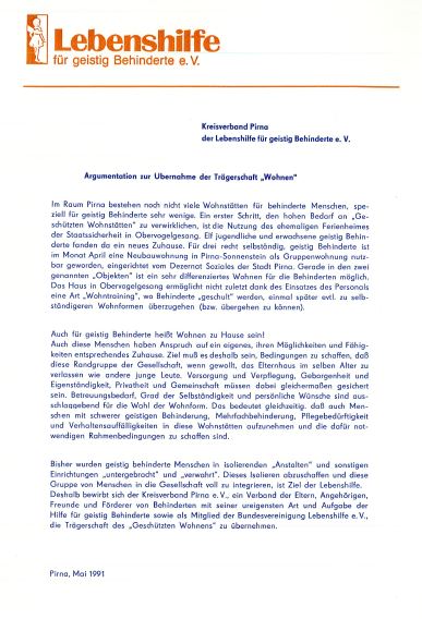 Im ersten Quartal 1991 wurde der erste Antrag zur Übernahme eines bestehenden Gebäudes als eine Art „Geschütztes Wohnen“ und ein weiterer zur Nutzung eines Raumes als Geschäftsstelle gestellt. Am 1. Juli 1991 übernahm der noch junge und unbekannte Verein die Trägerschaft eines Wohnheimes in Obervogelgesang und am 1. September 1991 begann die Arbeit in der vorläufigen Geschäftsstelle auf der Maxim-Gorkistraße in Pirna und am 15. November konnte die erste Wohnung im Rahmen betreutes Wohnen auf dem Sonnenstein bezogen werden. Das alles war nicht billig und der Geldfluss durch die Kostenträger kam nur langsam in die Gänge. Ein Überbrückungsdarlehen in Höhe von 60.000 DM musste aufgenommen werden und konnte später zurückgezahlt werden. Um die notwendigen Arbeitskräfte bezahlen zu können, gelang es der damaligen Vorsitzenden Frau Funke in Zusammenarbeit mit dem Arbeitsamt im Rahmen von Arbeitsbeschaffungsmaßnahmen die notwendigen Arbeitskräfte einzustellen. Viele dieser Mitarbeiter wurden im dauerhafte Arbeitsverhältnisse übernommen.