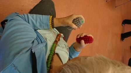 Zuerst gibt ein Bewohner jedem 2 Igelrollen aus und dann wird eine kleine Massage der Arme und Schultern ausgeführt, damit diese so richtig wach werden. Dann werden die Beine aufgeweckt. Zuerst wird das rechte Bein bewegt danach das linke Bein und dann alle beide. Es ist gar nicht so einfach, wo ist rechts und wo ist links aber gemeinsam finden es alle heraus. Alle überlegen der Reihe nach, wo sie im Gedanken hinlaufen - einer nach Neustadt, eine nach Sebnitz, eine sogar bis nach Bayern.
