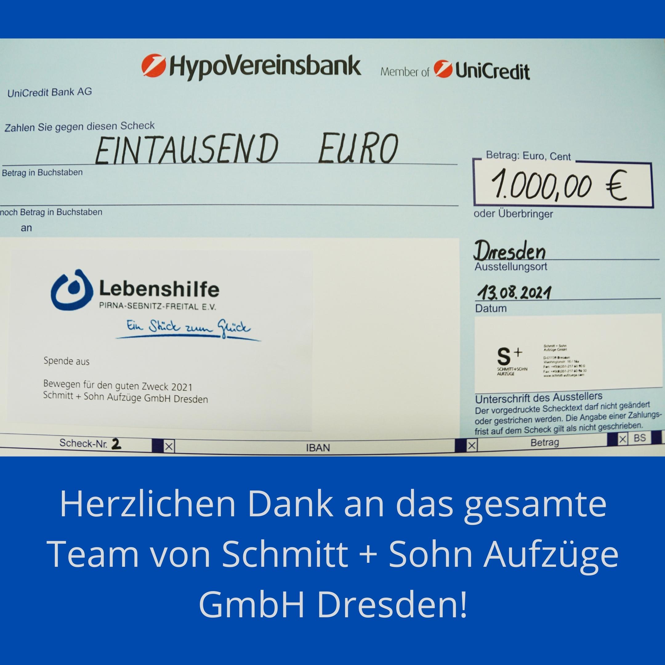 Mit 1000 Euro unterstützt die Firma Schmitt + Sohn Aufzüge unseren Lebenshilfe Verein. Darüber freuen wir uns sehr und bedanken uns ganz herzlich bei allen Mitarbeitern und Mitarbeiterinnen.