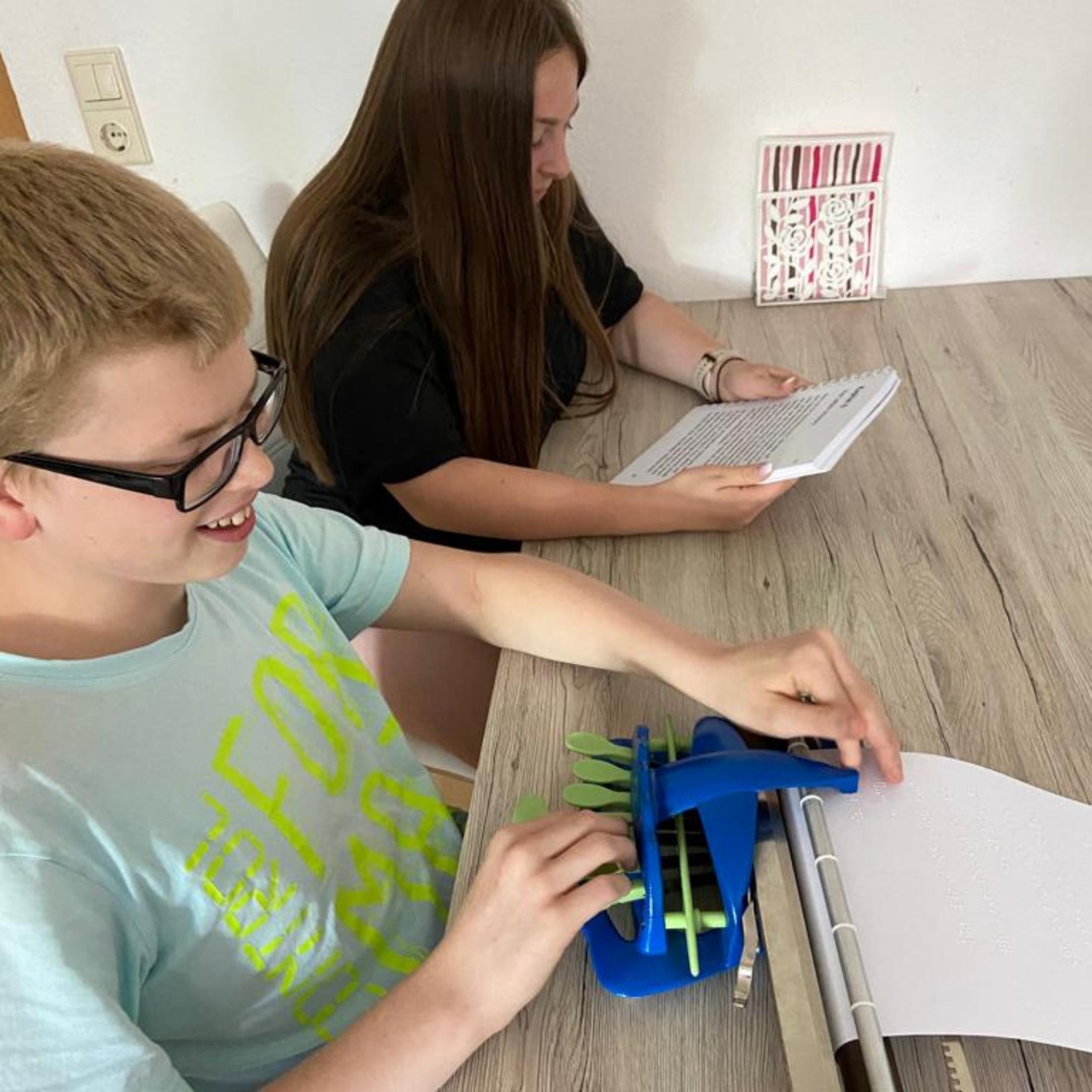 Pascal hat auch eine Erinnerung an sich in der Kita gelassen: Er hat gemeinsam mit seiner Schwester Dana Türschilder für alle Gruppen- und Gemeinschaftsräume in Braille-Schrift, einer Blindenschrift, angefertigt. Die haben sie dann gemeinsam auf Kinderhöhe an die Türen geklebt – so können die Kita-Kinder jetzt immer erfühlen, in welchen Raum sie gehen.