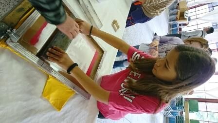 Danach geht es an die vorbereiteten Druckstationen. Als erstes muss das T-Shirt auf eine Platte aus Holz aufgezogen werden. Dann wird die Siebdruckfarbe auf das Sieb aufgebracht. Jetzt kann das erste Mädchen drucken. Es braucht etwas Kraft die Farbe durch das feinmaschige Sieb zu drücken und Herr Prades unterstützt, damit es auch gelingt.
