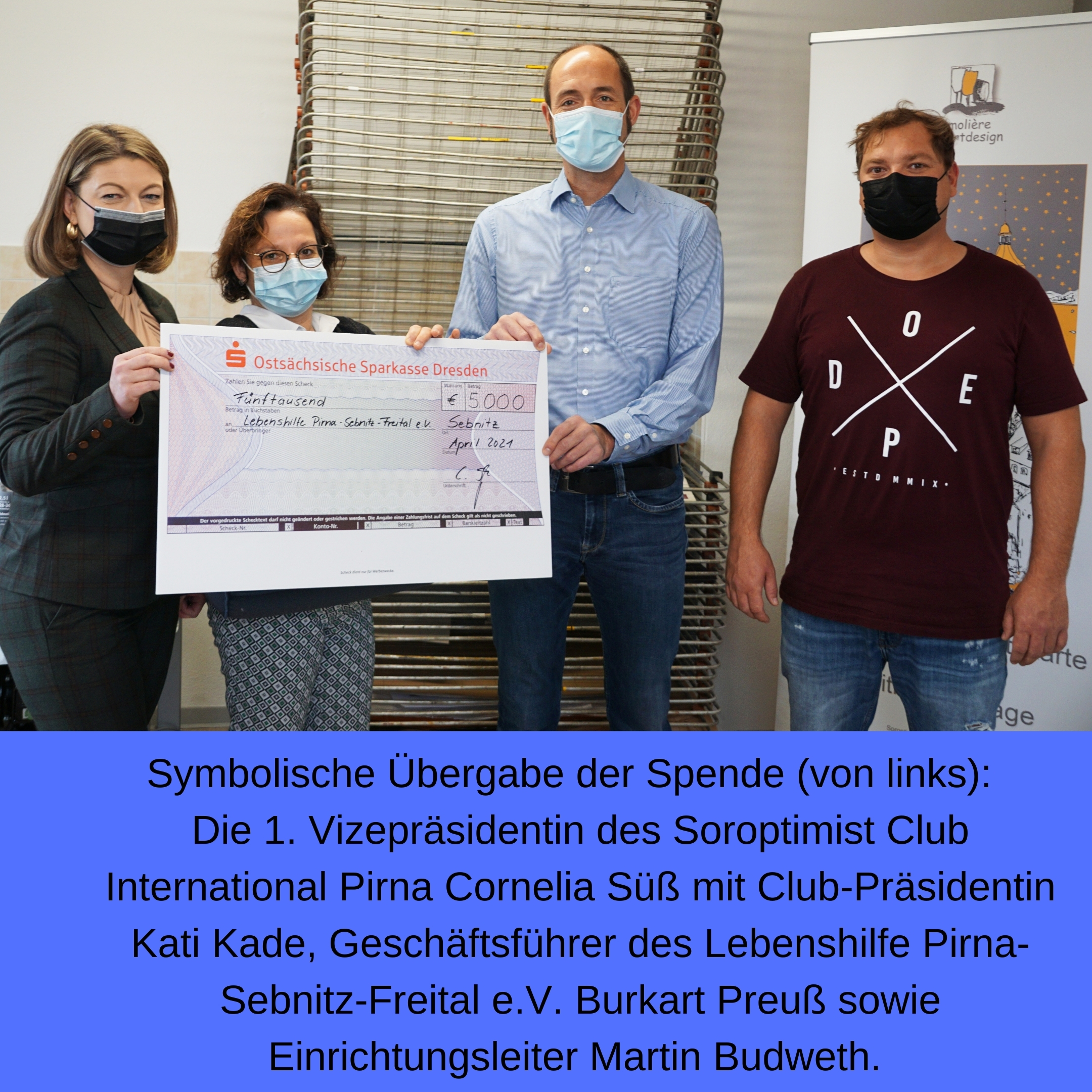 Am Mittwoch überreichten die Präsidentin Kati Kate und die 1. Vizepräsidentin Cornelia Süß den symbolischen Scheck an unseren Geschäftsführer Burkart Preuß sowie den Einrichtungsleiter Martin Budweth.