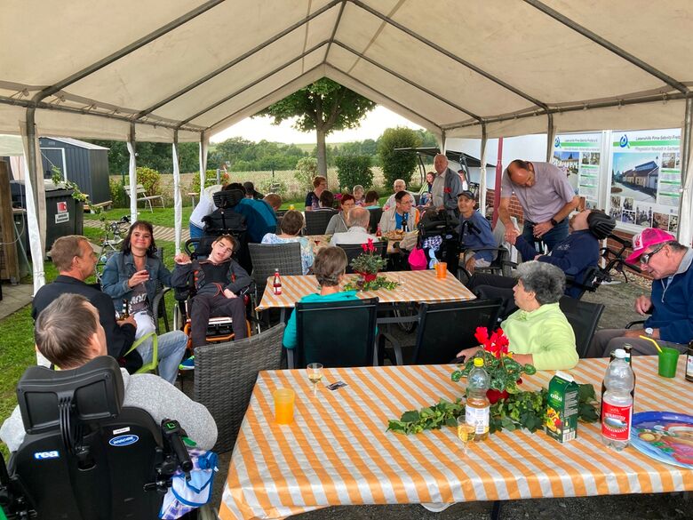 Bei Sonnenschein feiern zahlreiche Gäste, Klienten und Beschäftigte das 25-jährige Jubiläum der Hohwald-Werkstätten in Neustadt.
