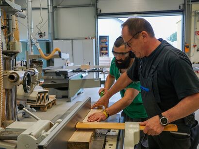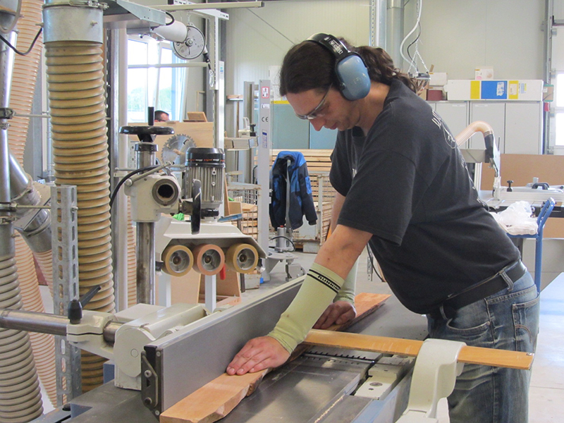 Der Holzbereich verfügt über 12 Arbeitsplätze und ist untergliedert in einen umfangreich ausgestatteten modernen Maschinenbereich mit Holzbearbeitungsmaschinen, sowie einem Raum für die Handbearbeitung von Holzprodukten.