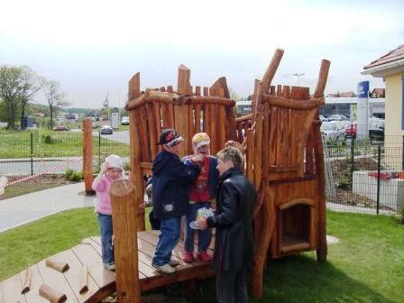 Ebenso wurde das Außengelände krippenspezifisch gestaltet, auf diesem befinden sich ein kleiner Sandkasten, ein Kleinkinder-Parcours und ein Rutschturm.